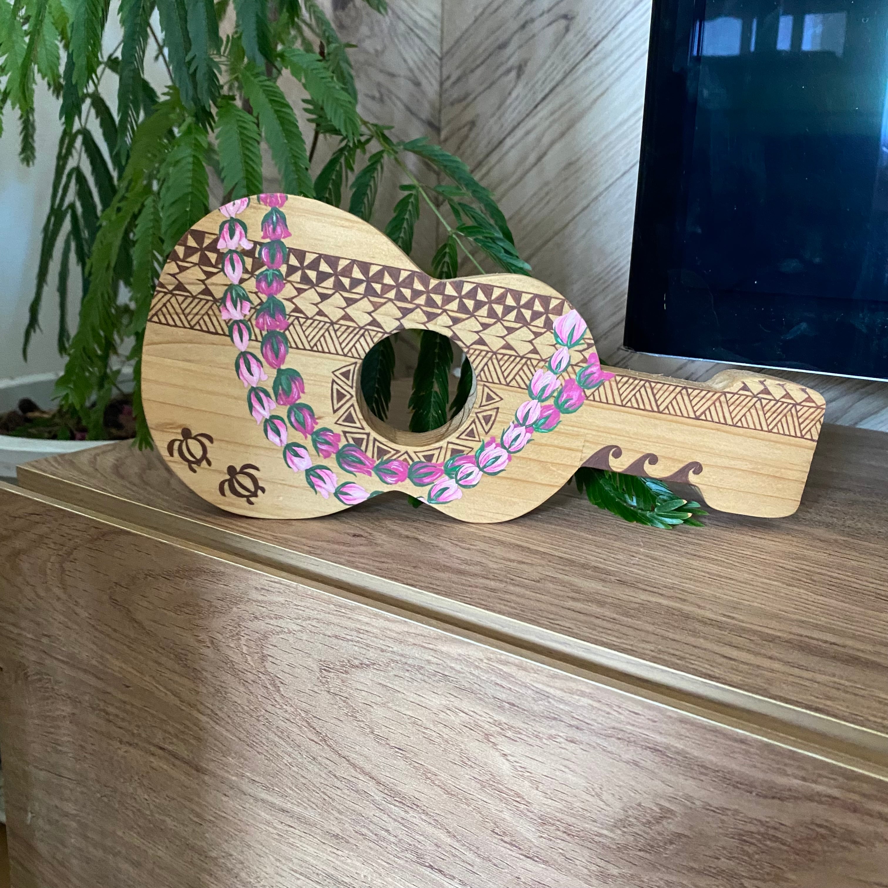 ハワイの雰囲気を感じさせる、手描きのウクレレオブジェです。